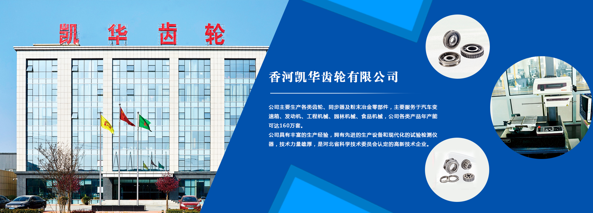 香河凱華齒輪有限公司是一家民營(yíng)企業(yè),位于香河經(jīng)濟(jì)開發(fā)區(qū),毗鄰京津,交通便利。公司占地面積7萬(wàn)平米,注冊(cè)資本1360萬(wàn)元,現(xiàn)有員工400余人,其中技術(shù)質(zhì)量工程人員70余名,擁有中高級(jí)職稱人員30余名。公司主要生產(chǎn)各類齒輪、同步器及粉末冶金零部件,主要適配汽車變速箱與發(fā)動(dòng)機(jī),公司各類產(chǎn)品年產(chǎn)能可達(dá)160萬(wàn)套。